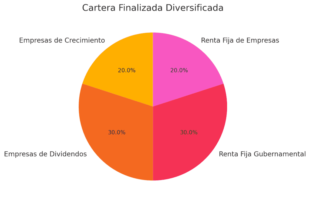 A medida que tu patrimonio crezca, podrás construir una cartera diversificada que combine diferentes tipos de activos para equilibrar riesgos y rendimientos. El siguiente gráfico ilustra una posible distribución en una cartera finalizada, ideal para inversores que buscan seguridad y crecimiento a largo plazo.